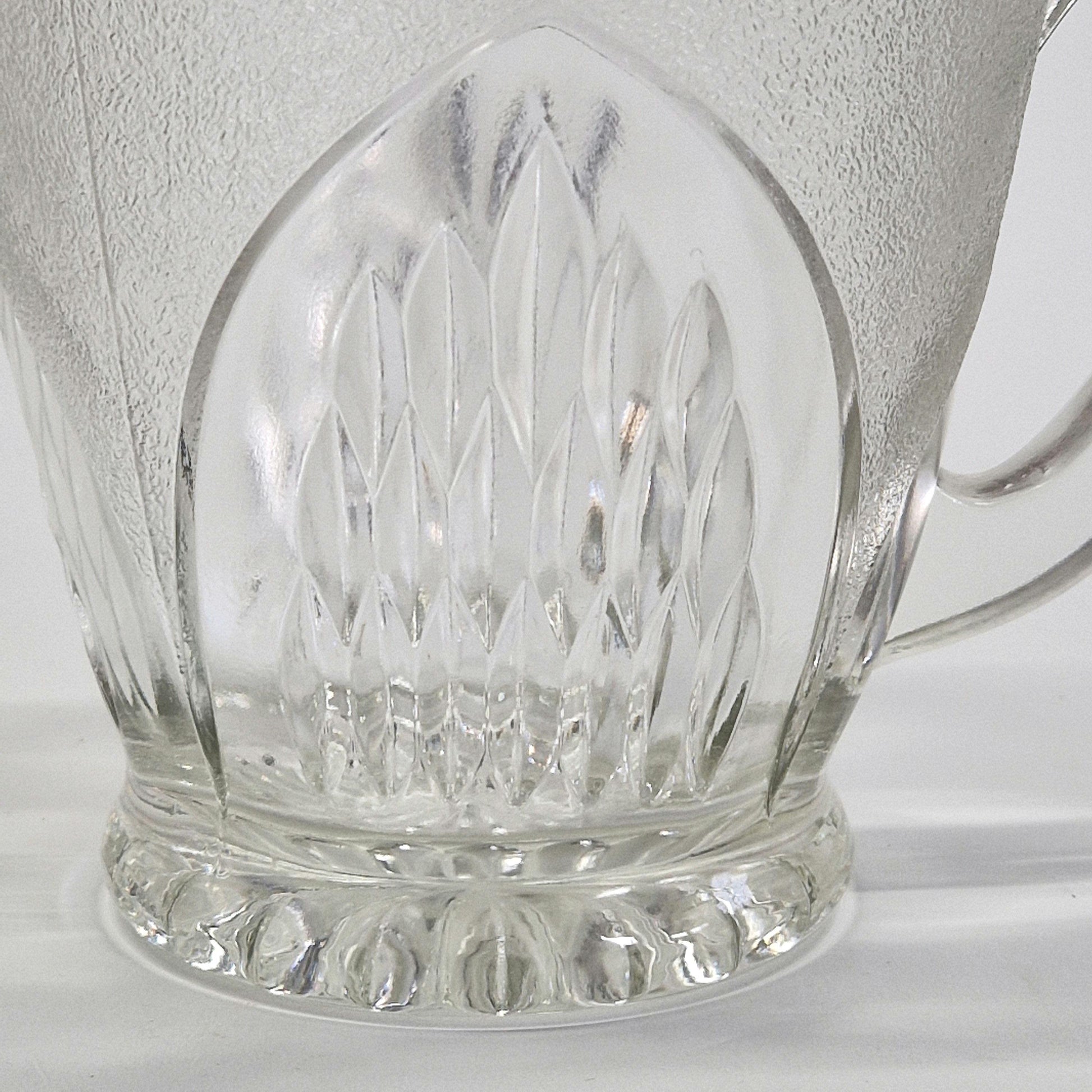 Clear and frosted pressed glass in Nordic design with leaf-shaped ovals and footed base with an impressed daisy design; and has a flat ergonomically designed handle. This jug is in good vintage condition, showcasing the durable quality of period glass