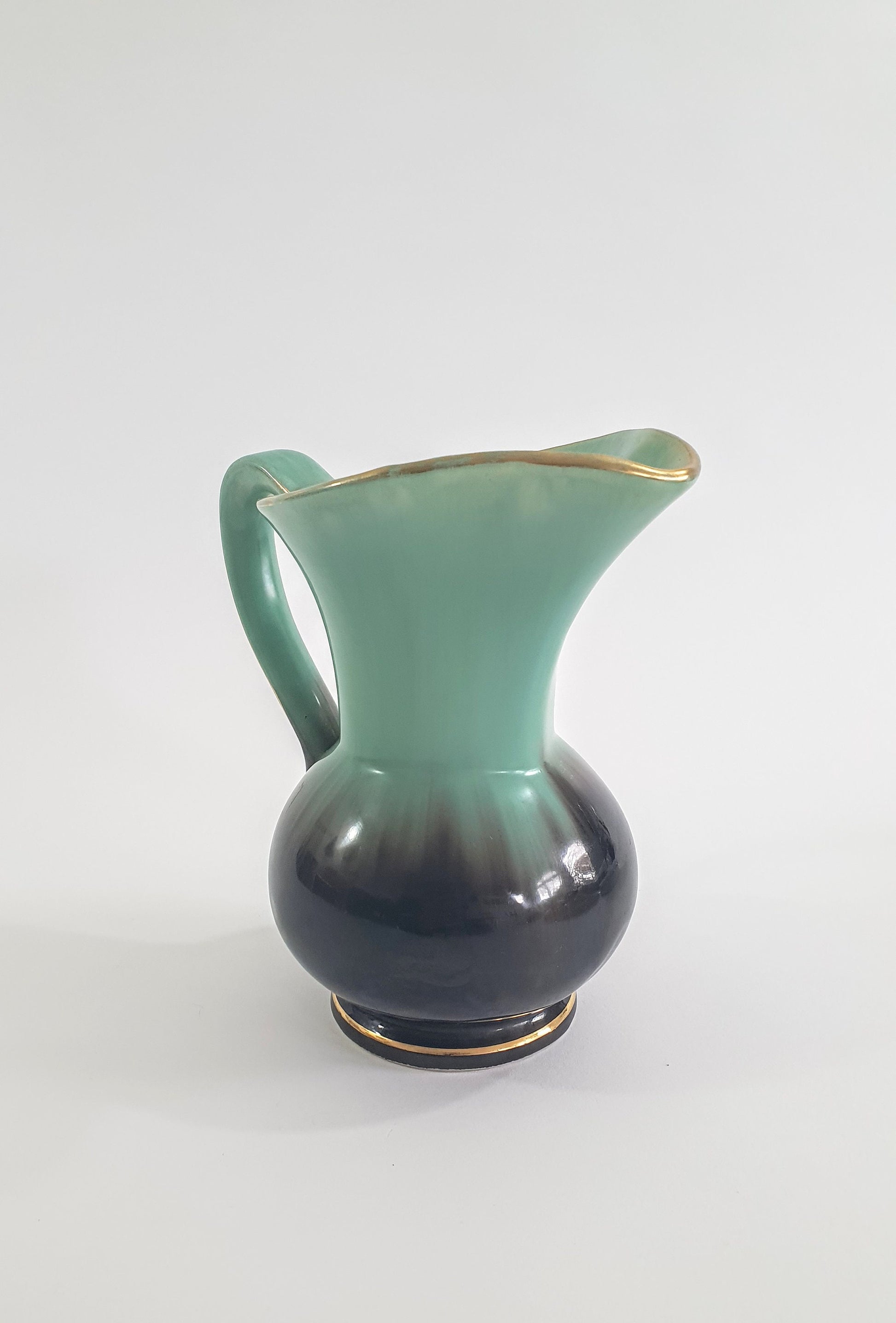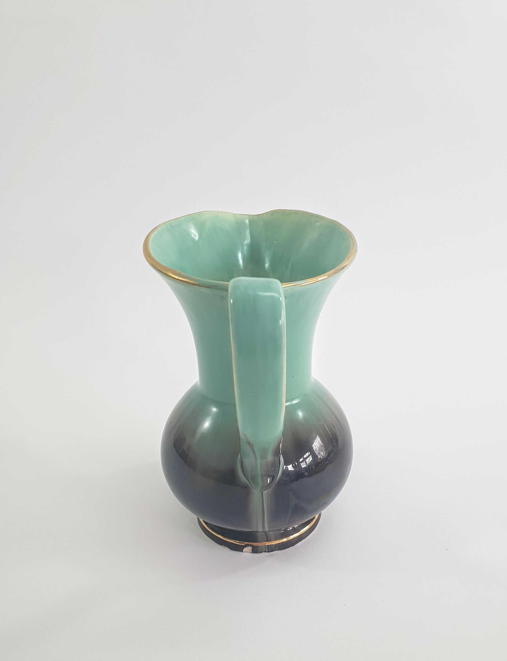 Footed based with gold band supports a round bulbous body, the slim neck flares out into a spout and the handle extends from the rim to the body. Drip ware glazing of mint green starts at the top 'dripping to black towards the centre of the body, the rim and sides of handle is gold painted.