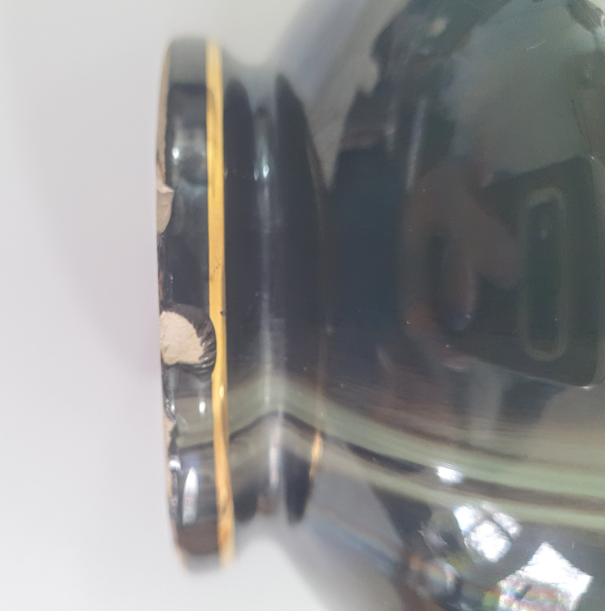 The jug vase is in good vintage condition with no cracks, there is a small chip under the handle at the base of the foot and there is no crazing. The gold rim and handle has some age related wear. See Photo.
